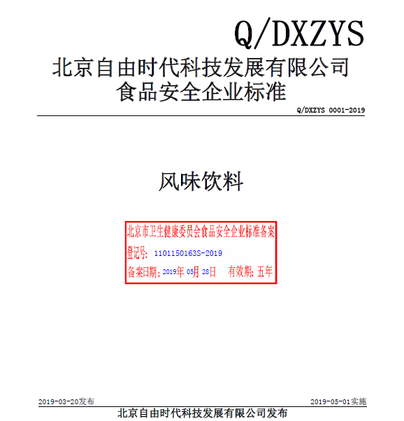 北京自由時(shí)代科技發(fā)展有限公司本次備案的企業(yè)標(biāo)準(zhǔn)《風(fēng)味飲料》,經(jīng)過(guò)我公司技術(shù)人員池建敏老師的編寫(xiě)、備案,所提交的材料符合北京市衛(wèi)健委的備案要求,于2019年05月成功備案并在北京市食品安全標(biāo)準(zhǔn)管理系統(tǒng)公示。