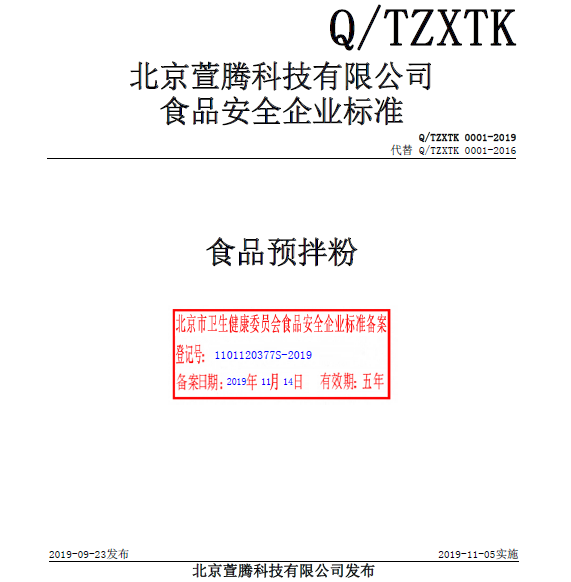 北京萱騰科技有限公司本次備案的企業(yè)標(biāo)準(zhǔn)《食品預(yù)拌粉》,經(jīng)過我公司技術(shù)人員朱麗真老師的編寫、備案,所提交的材料符合北京市衛(wèi)健委的備案要求,于2019年11月成功備案并在北京市食品安全標(biāo)準(zhǔn)管理系統(tǒng)公示。