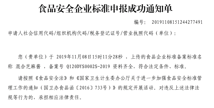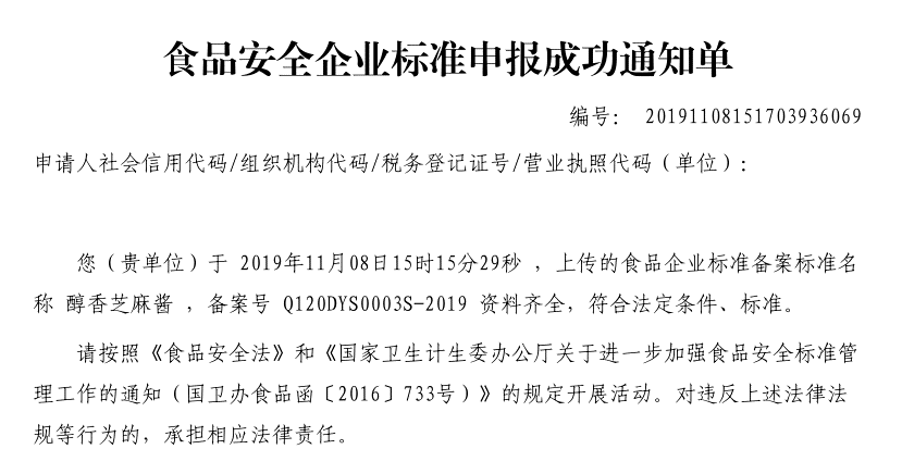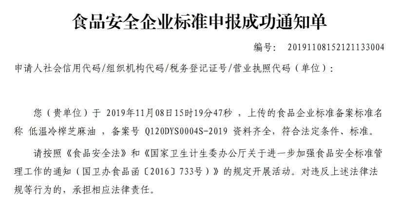 天津東宇順油脂股份有限公司本次備案的企業(yè)標(biāo)準(zhǔn)《低溫冷榨芝麻油》、《混合芝麻醬》、《醇香芝麻醬》,經(jīng)過(guò)我公司技術(shù)人員朱麗真老師的編寫、備案,所提交的材料符合天津市衛(wèi)健委的備案要求,于2019年11月成功備案。