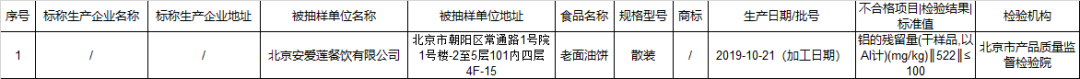 1. 油炸面制品(自制)抽檢項(xiàng)目包括鋁的殘留量(干樣品,以Al計(jì))等1個(gè)指標(biāo)。