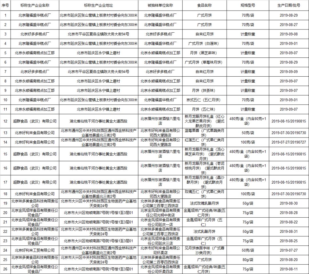 月餅抽檢項(xiàng)目包括大腸菌群、山梨酸及其鉀鹽(以山梨酸計(jì))、沙門氏菌、脫氫乙酸及其鈉鹽(以脫氫乙酸計(jì))、苯甲酸及其鈉鹽(以苯甲酸計(jì))、過(guò)氧化值(以脂肪計(jì))、酸價(jià)(以脂肪計(jì))、金黃色葡萄球菌、鉛(以Pb計(jì))、鋁的殘留量(干樣品,以Al計(jì))、防腐劑混合使用時(shí)各自用量占其最大使用量的比例之和、霉菌等12個(gè)指標(biāo)。