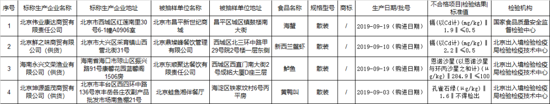 2. 海水蟹抽檢項(xiàng)目包括呋喃唑酮代謝物、呋喃妥因代謝物、呋喃它酮代謝物、呋喃西林代謝物、土霉素、孔雀石綠、恩諾沙星(以恩諾沙星與環(huán)丙沙星之和計(jì))、氯霉素、鉛(以Pb計(jì))、鉻(以Cr計(jì))、鎘(以Cd計(jì))等11個(gè)指標(biāo)。