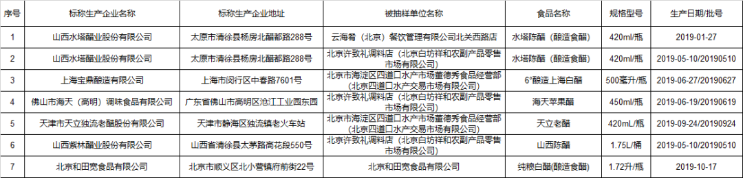 釀造食醋、配制食醋抽檢項(xiàng)目包括大腸菌群、對(duì)羥基苯甲酸酯類及其鈉鹽(以對(duì)羥基苯甲酸計(jì))、山梨酸及其鉀鹽(以山梨酸計(jì))、總砷(以As計(jì))、總酸(以乙酸計(jì))、游離礦酸、糖精鈉(以糖精計(jì))、脫氫乙酸及其鈉鹽(以脫氫乙酸計(jì))、苯甲酸及其鈉鹽(以苯甲酸計(jì))、鉛(以Pb計(jì))、防腐劑混合使用時(shí)各自用量占其最大使用量的比例之和、阿斯巴甜、黃曲霉毒素B1等13個(gè)指標(biāo)。