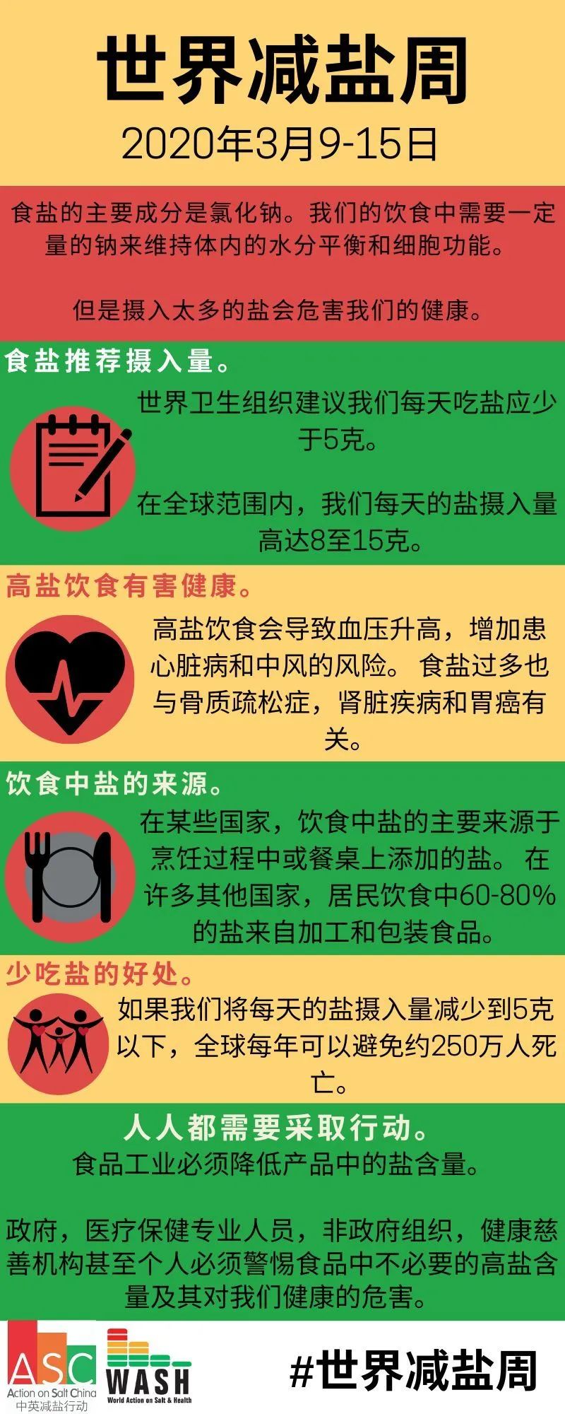 “世界鹽與健康行動(dòng)”(World Action On Salt and Health, WASH)于2005年由英國(guó)創(chuàng)立,全球已有近100個(gè)國(guó)家加入,其中每年3月份舉行“世界減鹽周”(World Salt Awareness Week)活動(dòng),在世界各地廣泛開(kāi)展鹽與健康的宣傳倡導(dǎo),以提高公眾對(duì)高鹽飲食危害健康的認(rèn)識(shí),鼓勵(lì)每個(gè)人在日常生活中做出更加健康的選擇;同時(shí)號(hào)召政府、食品企業(yè)采取積極行動(dòng),設(shè)定減鹽目標(biāo)、制定減鹽政策,共同營(yíng)造有利于人群健康的社會(huì)環(huán)境。