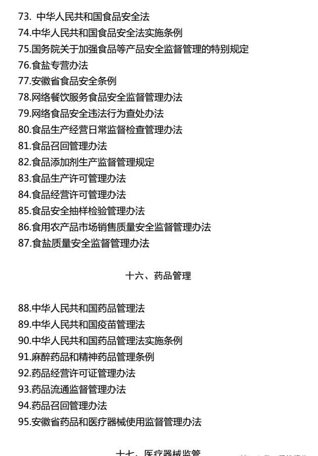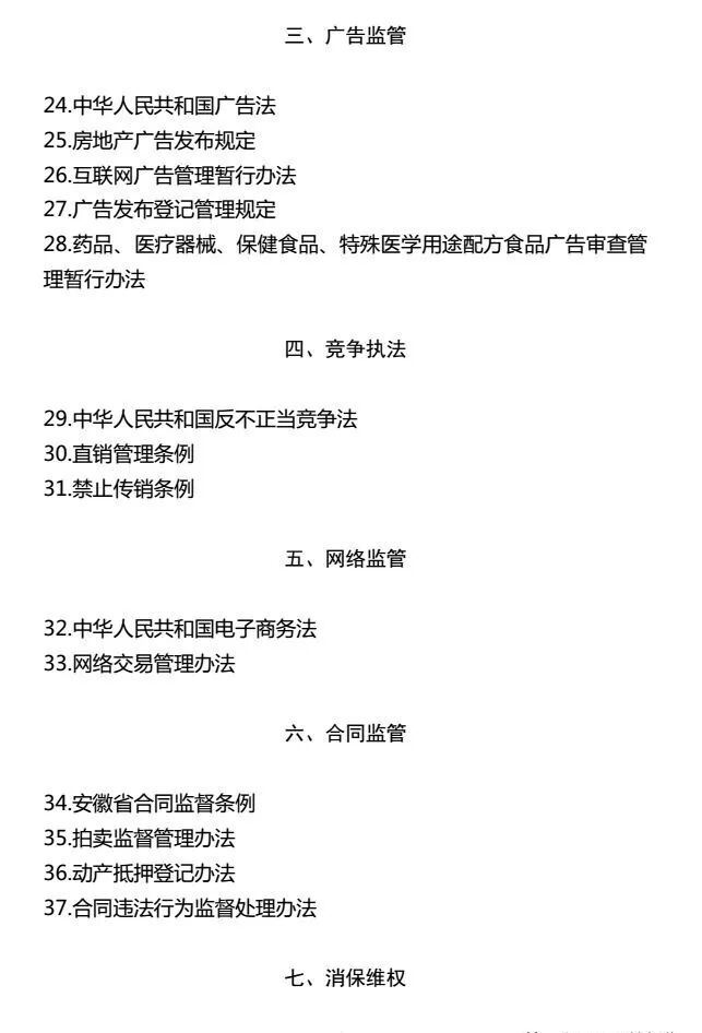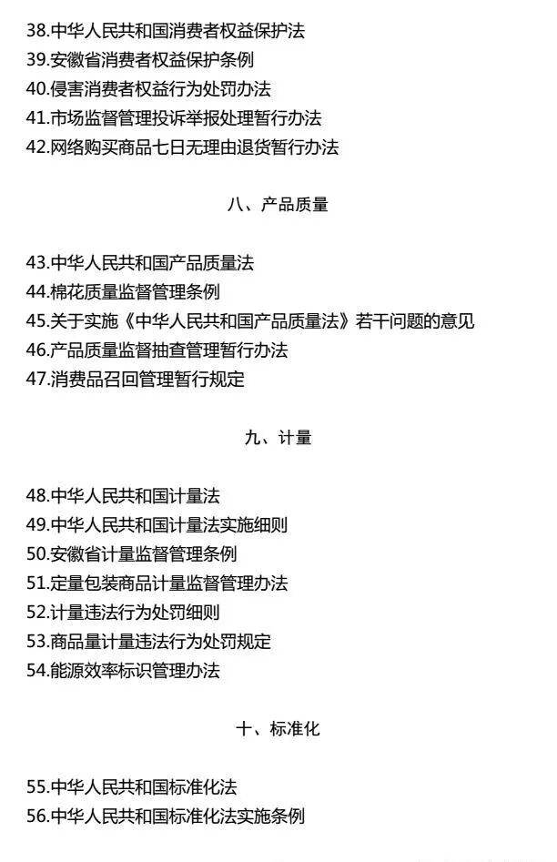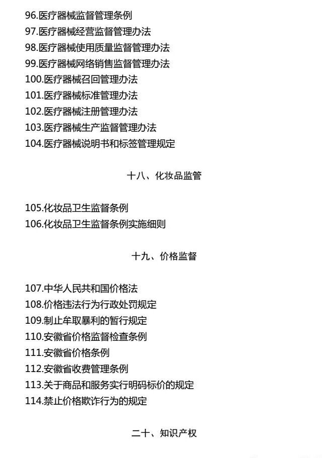 《公司法》、《廣告法》、《反壟斷法》、《反不正當競爭法》、《價格法》、《產(chǎn)品質(zhì)量法》、《計量法》、《專利法》、《特種設(shè)備法》、《疫苗管理法》、《藥品管理法》、《商標法》、《食品安全法》、《消費者權(quán)益保護法》……總共近400部,常用超130部!