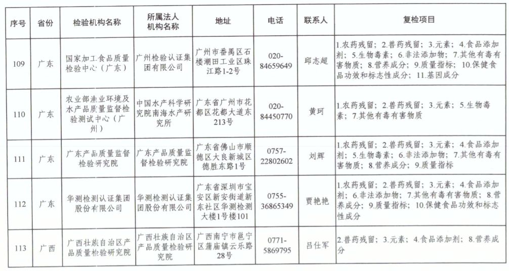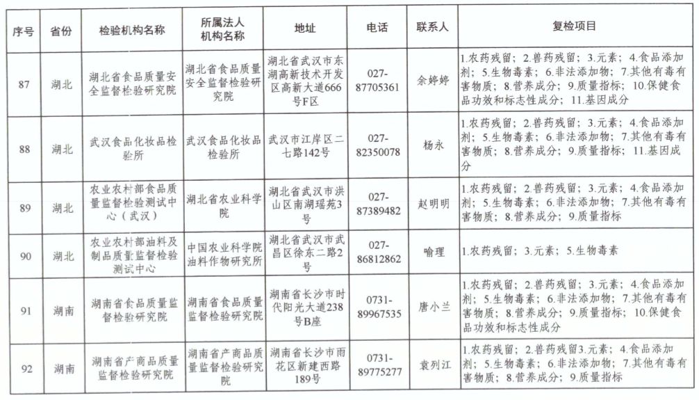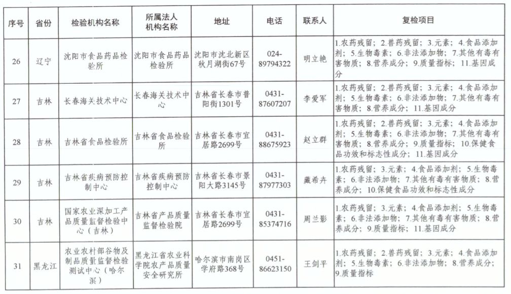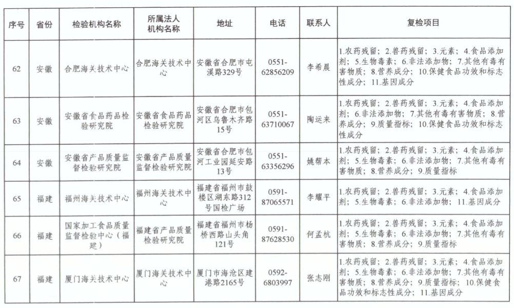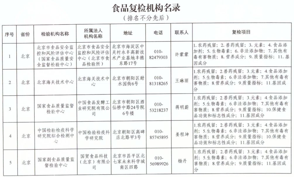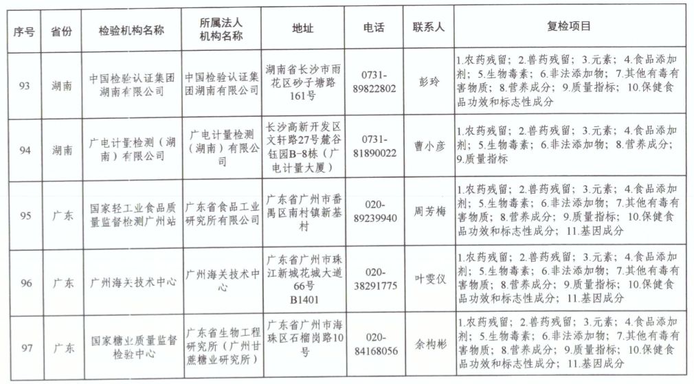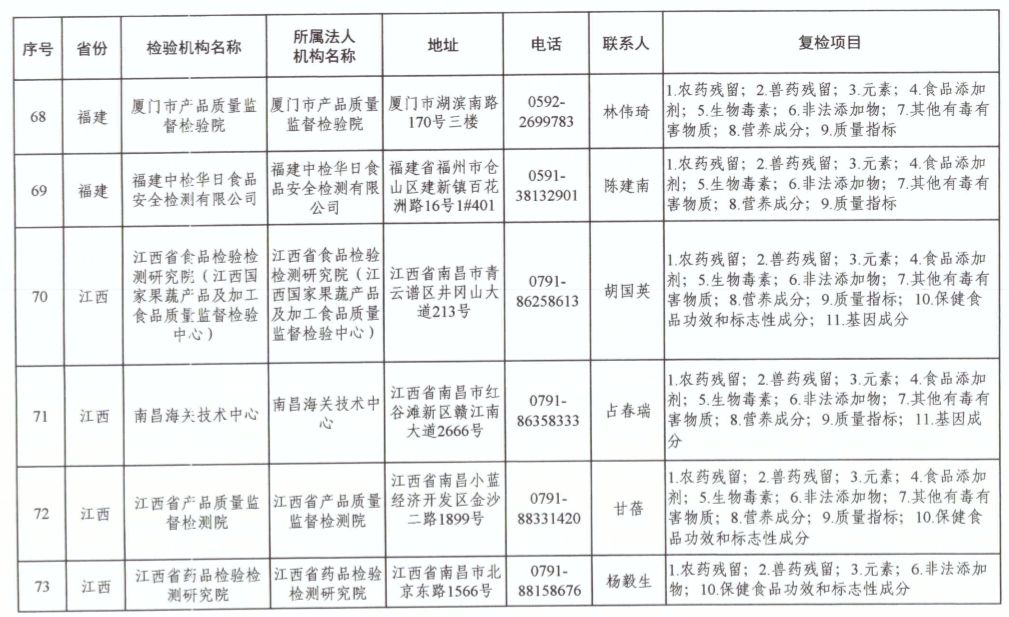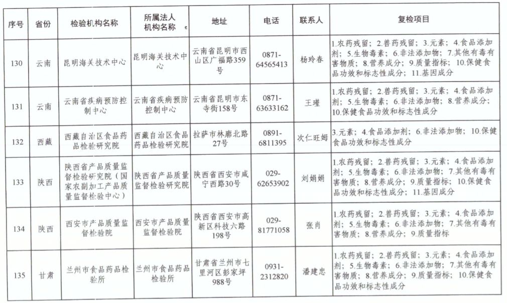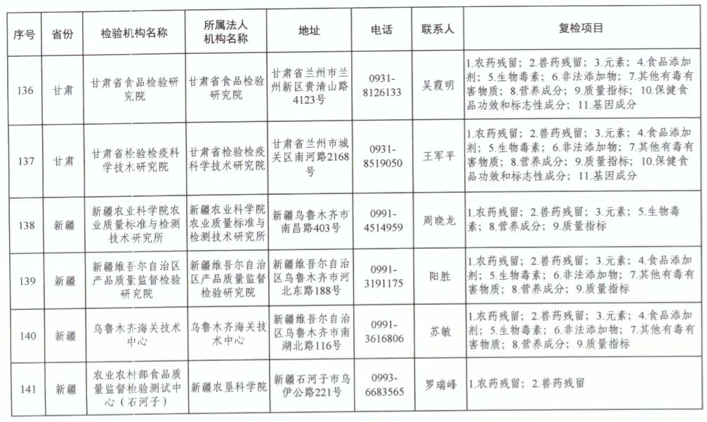 為滿足食品復(fù)檢需要,依據(jù)《中華人民共和國食品安全法》及其實(shí)施條例,市場(chǎng)監(jiān)管總局、國家衛(wèi)生健康委和農(nóng)業(yè)農(nóng)村部對(duì)食品復(fù)檢機(jī)構(gòu)進(jìn)行了重新確認(rèn),現(xiàn)將更新后的141家食品復(fù)檢機(jī)構(gòu)名錄(附后)予以公布,特此公告。