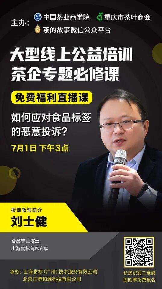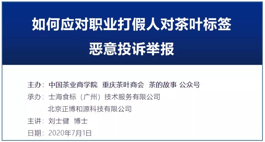 為幫助茶葉生產(chǎn)、流通企業(yè)解決屢遭職業(yè)打假人對(duì)食品標(biāo)簽惡意投訴及舉報(bào)的困境,由中國(guó)茶業(yè)商學(xué)院、重慶市茶葉商會(huì)、茶的故事微信公眾平臺(tái)聯(lián)合主辦,士海食標(biāo)及正博和源承辦的《茶企如何應(yīng)對(duì)食品標(biāo)簽惡意投訴舉報(bào)》大型線上公益培訓(xùn)于2020年7月1日成功舉行,我公司劉士健博士、池建敏和湯婷老師承擔(dān)了這次培訓(xùn)授課任務(wù)。